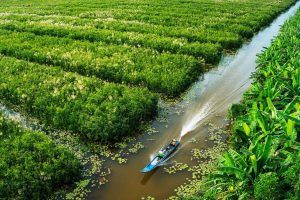 Un vasto reticolo di migliaia di canali caratterizza la vita nel Delta del Mekong, che si estende su 40.000 km². Il colore giallo dell’acqua è dovuto ai sedimenti che fertilizzano, durante tutto l’anno, i campi e i rigogliosi frutteti della regione. Immensi fiumi e risaie sono punteggiati da stagni di loto. Il principale mezzo di trasporto è la barca.